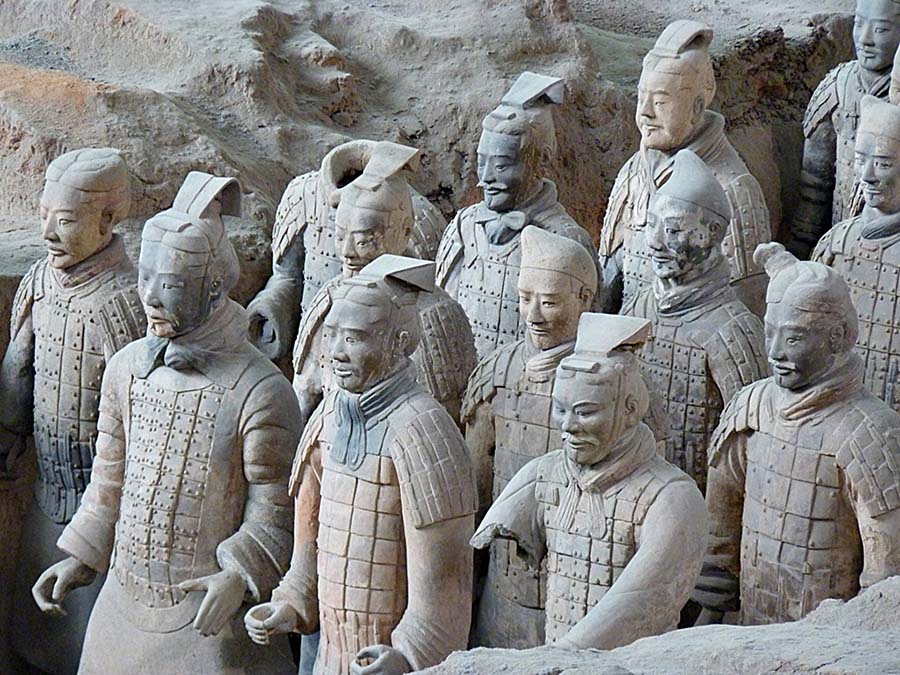 لقد تم دفن هؤلاء المحاربين مع الامبراطور كين شي وانج أول إمبراطور للصين وصاحب فكرة بناء سور الصين العظيم، حيث أمر الإمبراطور كين شين وانج عام 246 قبل الميلاد ببناء هذا الجيش من المحاربين ليتم دفنهم معه عند وفاته على ألا يوجد بينهم جنديين متشابهين. وبالفعل شارك في بناء هذا الجيش ما يقرب من 700 شخص. لقد تم اكتشافه بالصدفة عام 1974 أثناء قيام مجموعة مزارعين بحفر بئر. وقد قامت منظمة اليونسكو بإضافة هذا المعلم الأثري ضمن قائمة التراث الإنساني العالمي.