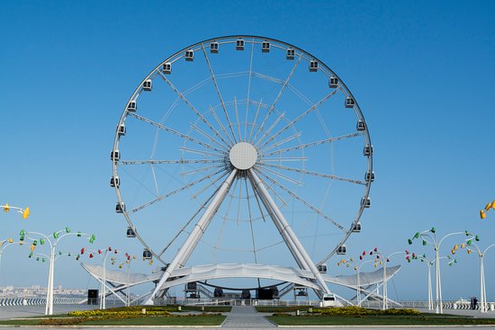 Continue to the tour with Baku Ferris Wheel also known as the Baku Eye - is a Ferris wheel on Baku Boulevard in the Seaside National Park of Baku. The wheel is 60 metres (200 ft) tall and has 30 cabins, each holding eight people. It makes a complete turn in 30 to 40 minutes.
